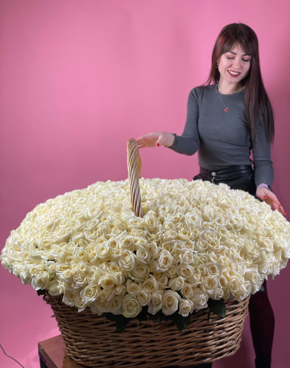 Белые розы и эустома образуют воздушную композицию с мягкими переходами между соцветиями. Хризантемы и маттиола добавляют объема, а гипсофила создает легкую дымку по краям. Корзина выглядит свежо и собранно в любом пространстве.