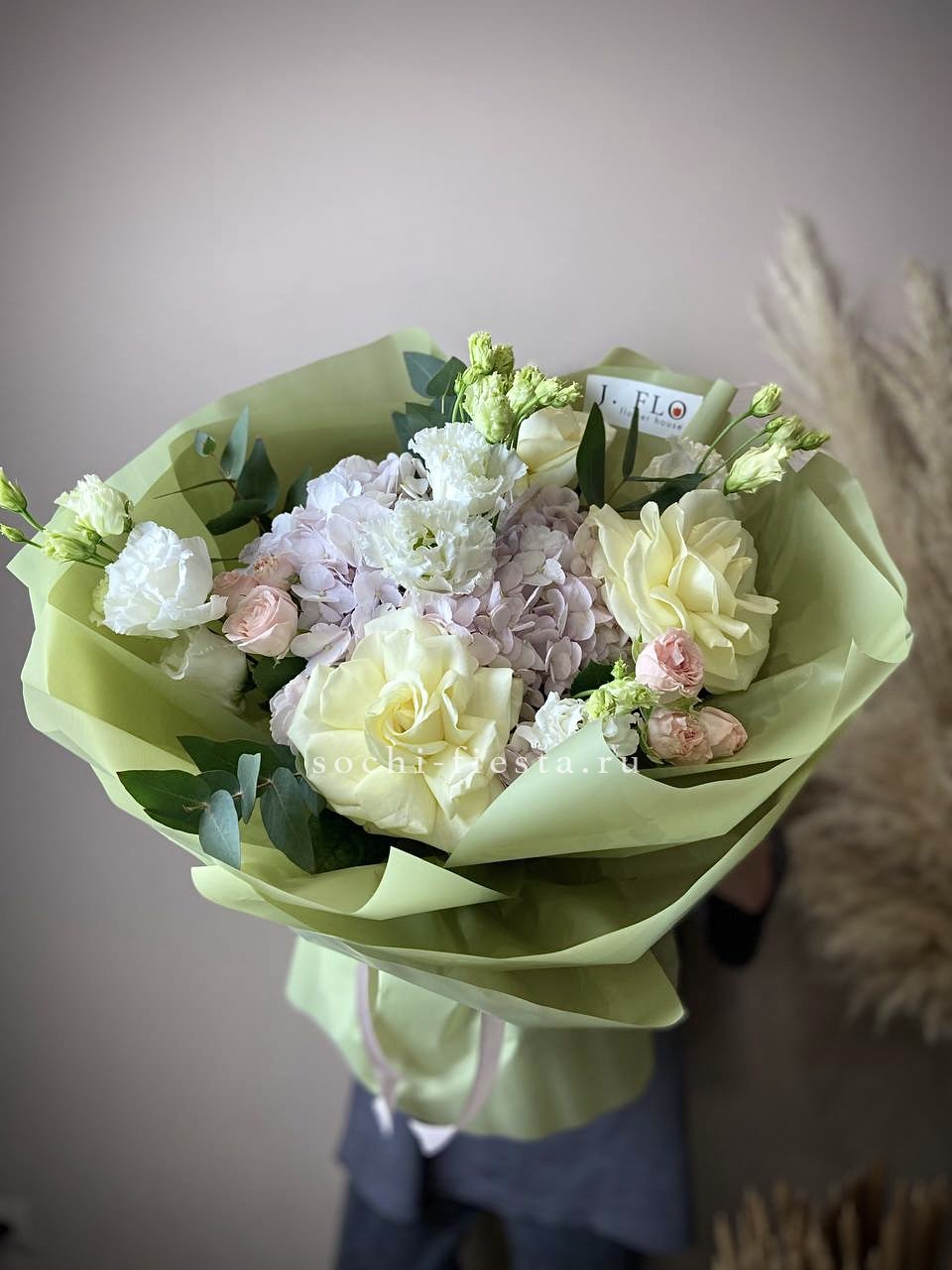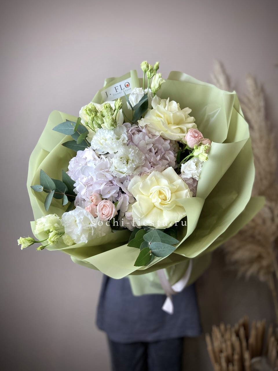 розы, кустовые розы, гортензия, маттиола (или аналог вне сезона), эустома, эвкалипт, лента, дизайнерская упаковка.