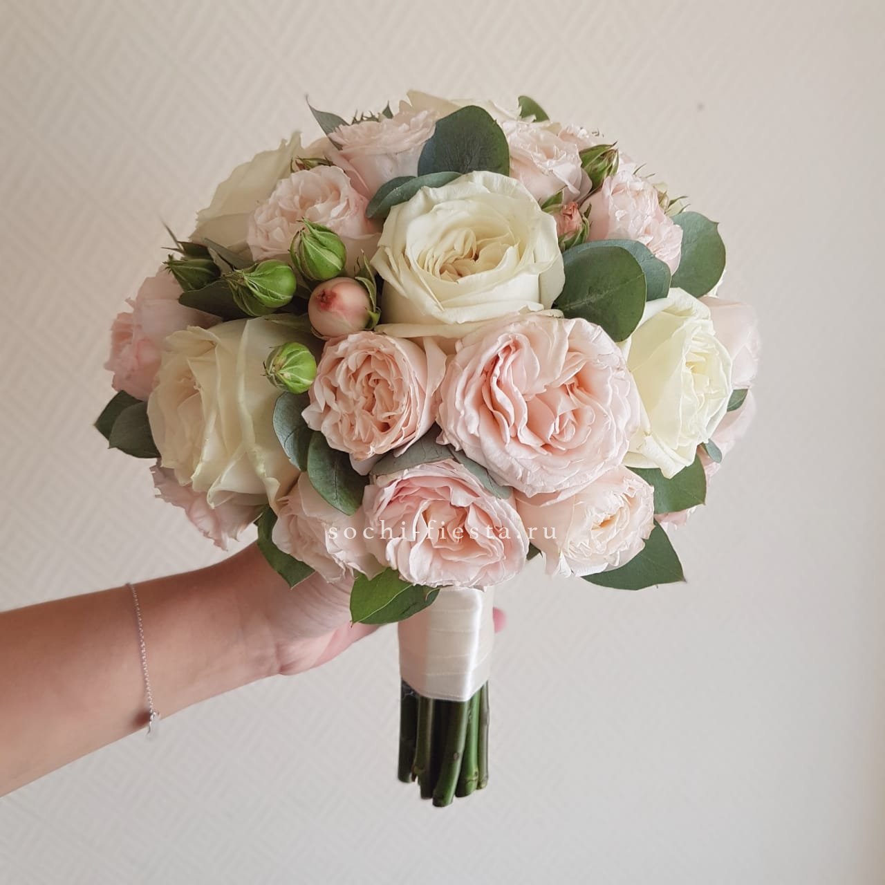пионовидные розы Бомбастик, одноголовые розы, эвкалипт, лента.