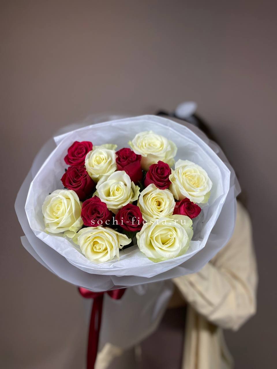 Пятнадцать роз в красно-белом исполнении собраны аккуратно и компактно. Такая композиция удобна для размещения на столе и не требует высоких ваз.