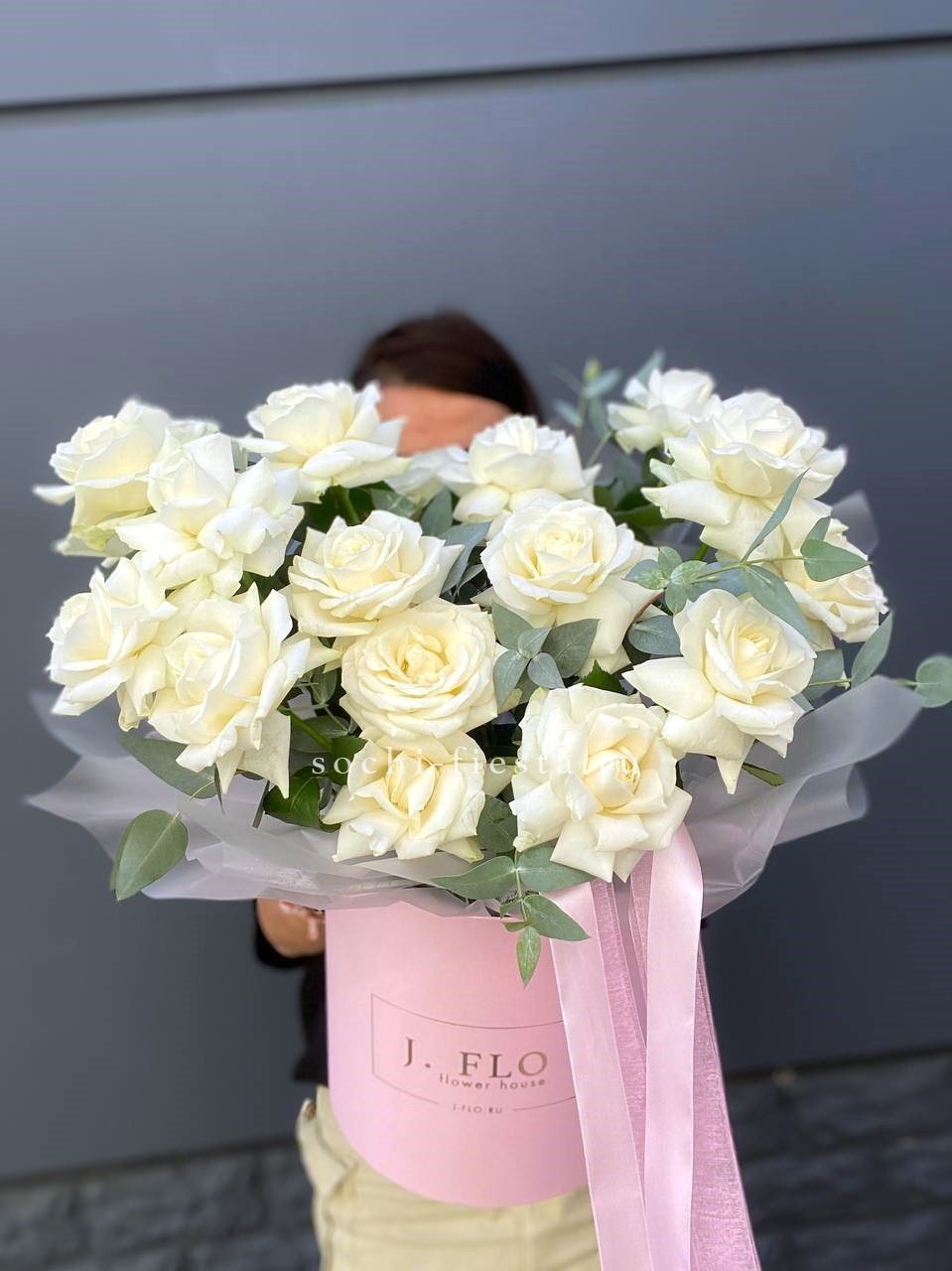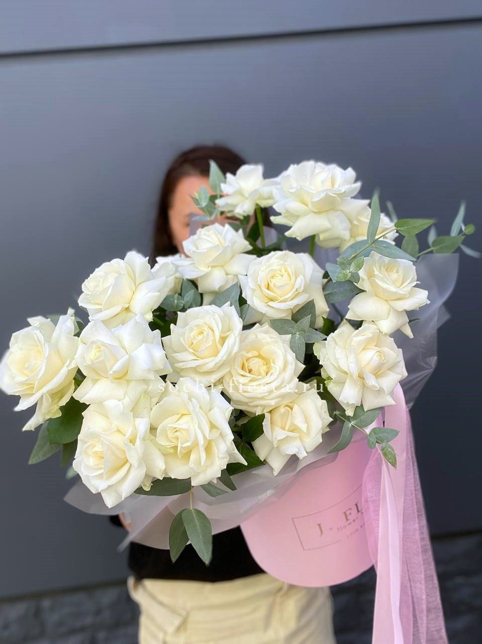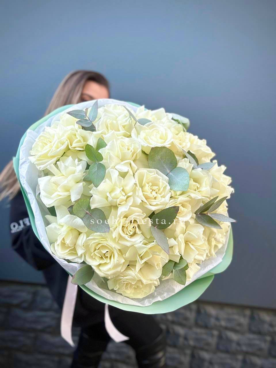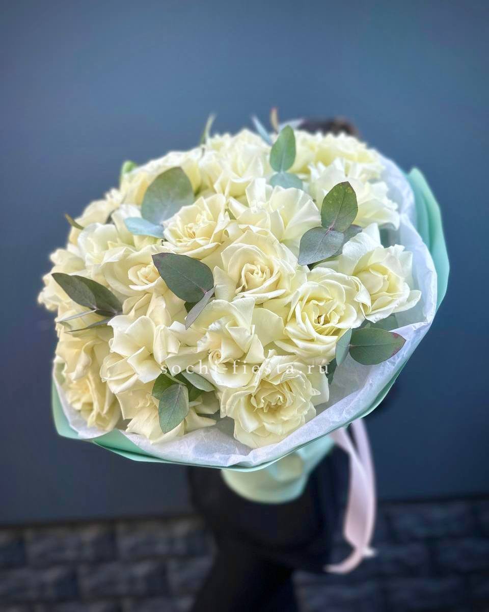белые розы с эвкалиптом в сумочке.