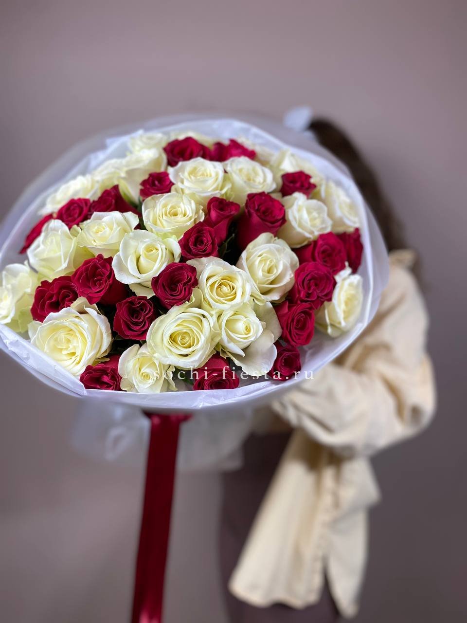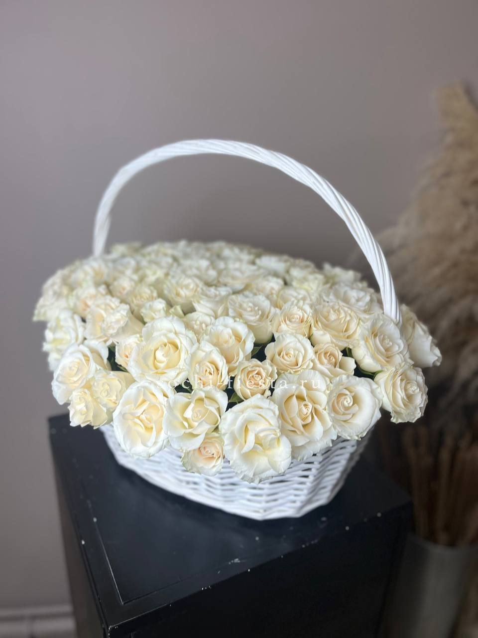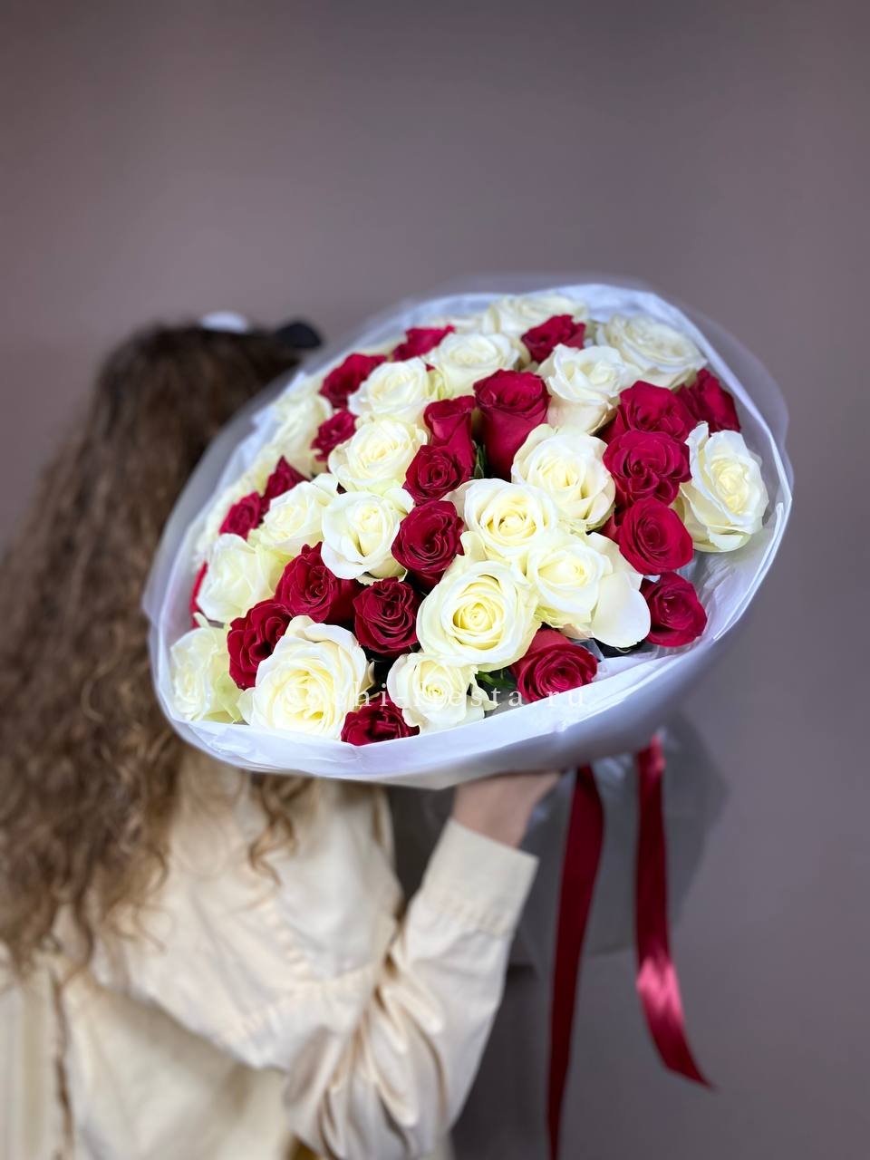 Тридцать один белоснежный бутон собран в плотную округлую форму и дополнен серебристыми ветками эвкалипта. Белый крафт сохраняет природную графику композиции и подчёркивает её объём.
