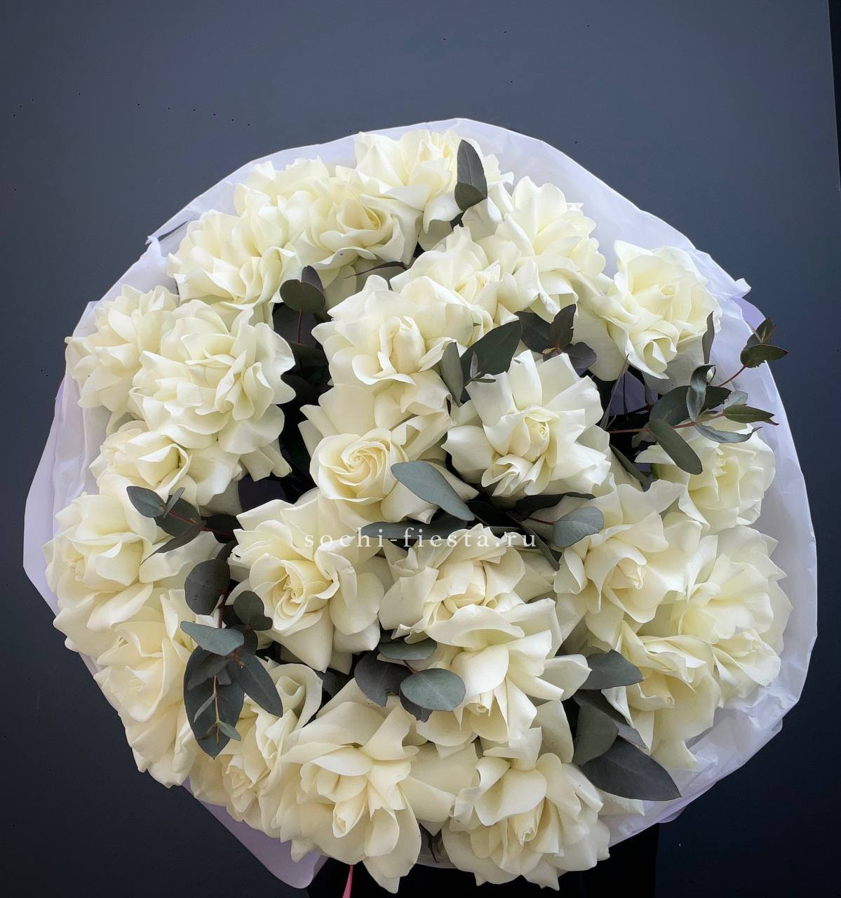 Тридцать семь белых французских роз собраны в круглый бокс с ветками эвкалипта. Плотная укладка бутонов создает объемную композицию, где каждый цветок виден и держит форму. Безупречное решение для яркого события.