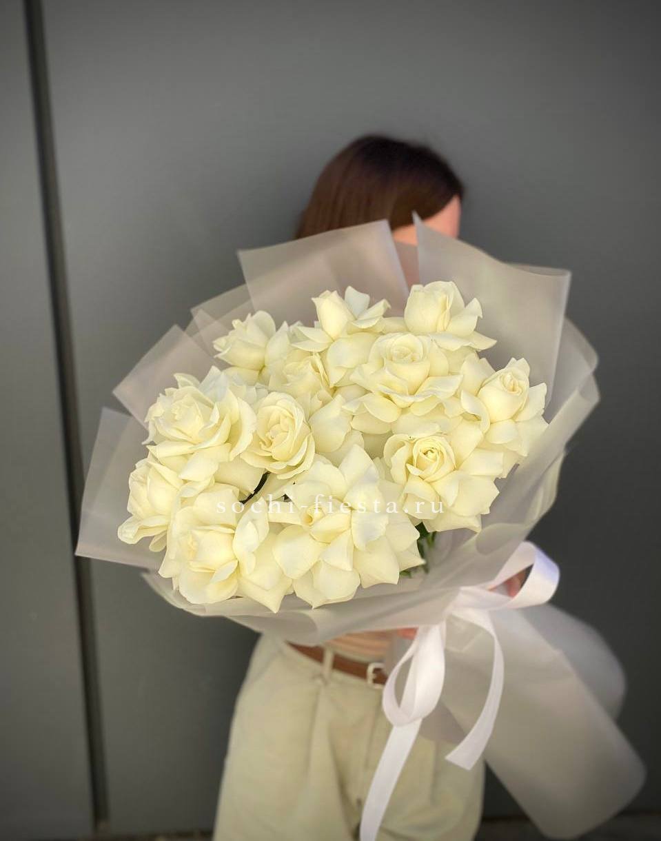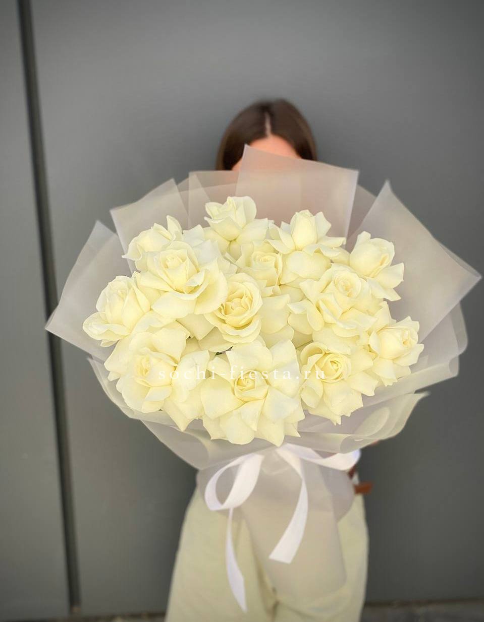 Тридцать девять бутонов образуют плотную белоснежную сферу. Каждый цветок раскрывается постепенно, сохраняя свежесть и форму на протяжении многих дней. Классика в чистом виде.