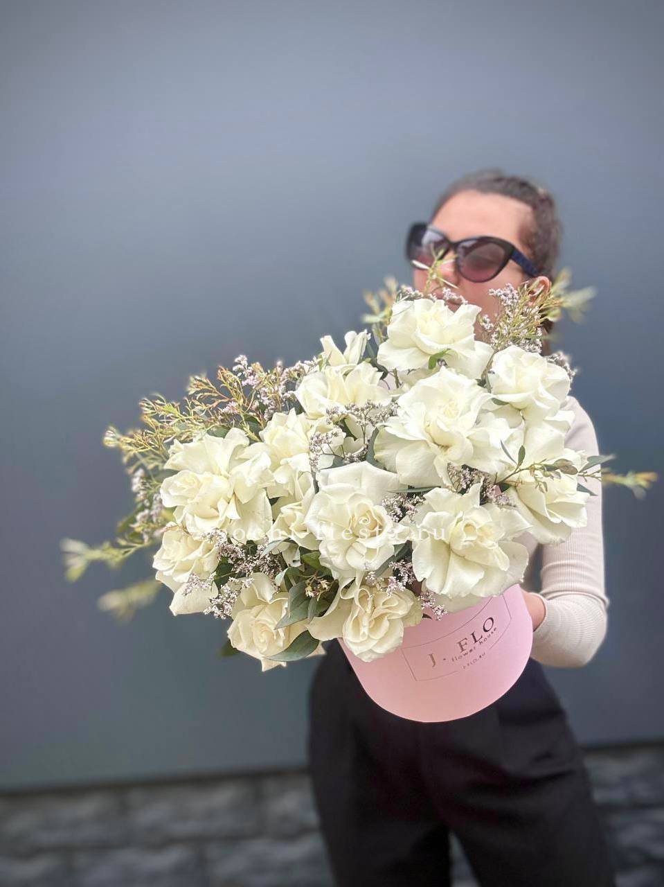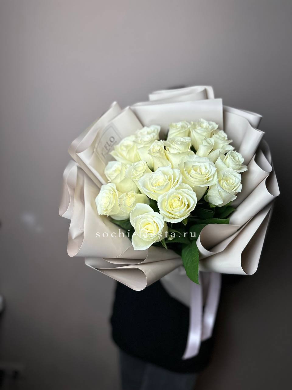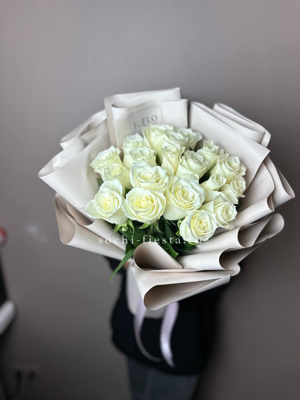 Классический букет из пятнадцати белых роз в упаковке из фоамирана держит форму и остается свежим долгое время. Компактная композиция удобна для транспортировки и размещения в любом интерьере.