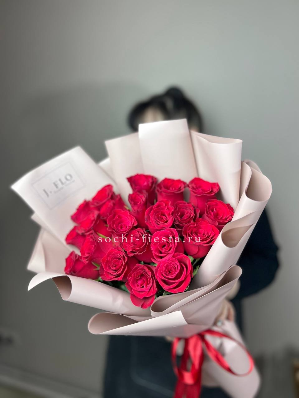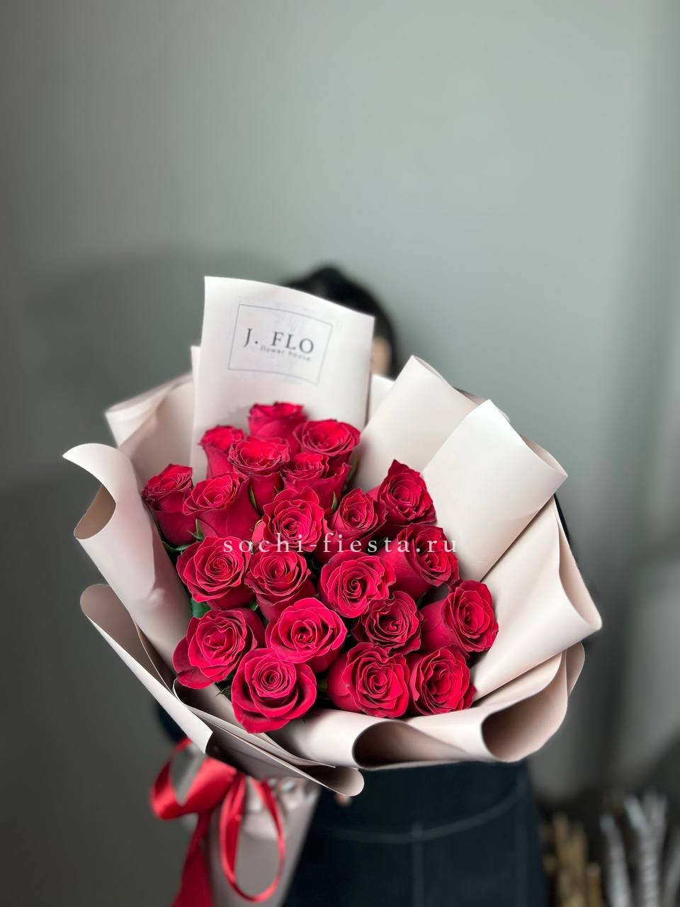 19 алых роз, лента, оформление.