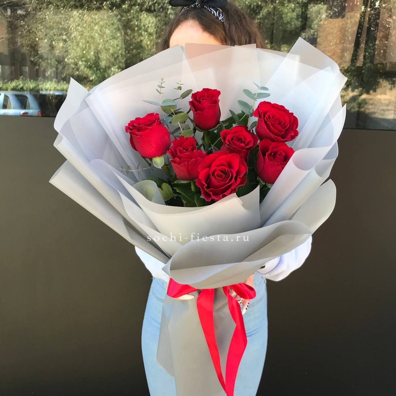 7 красных роз, эвкалипт, упаковка, лента.