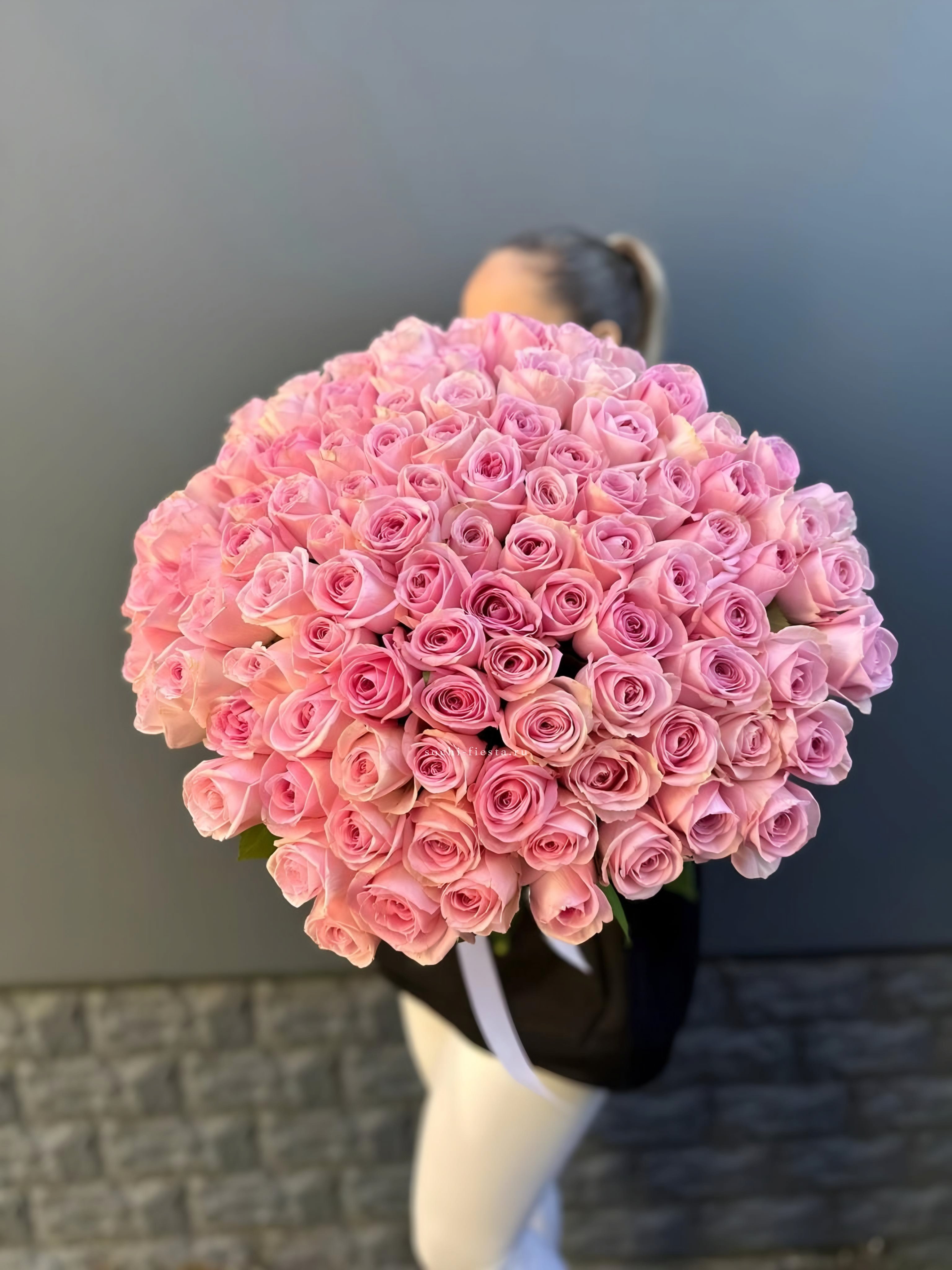 33 розовых роз, эвкалипт, лента, упаковка.