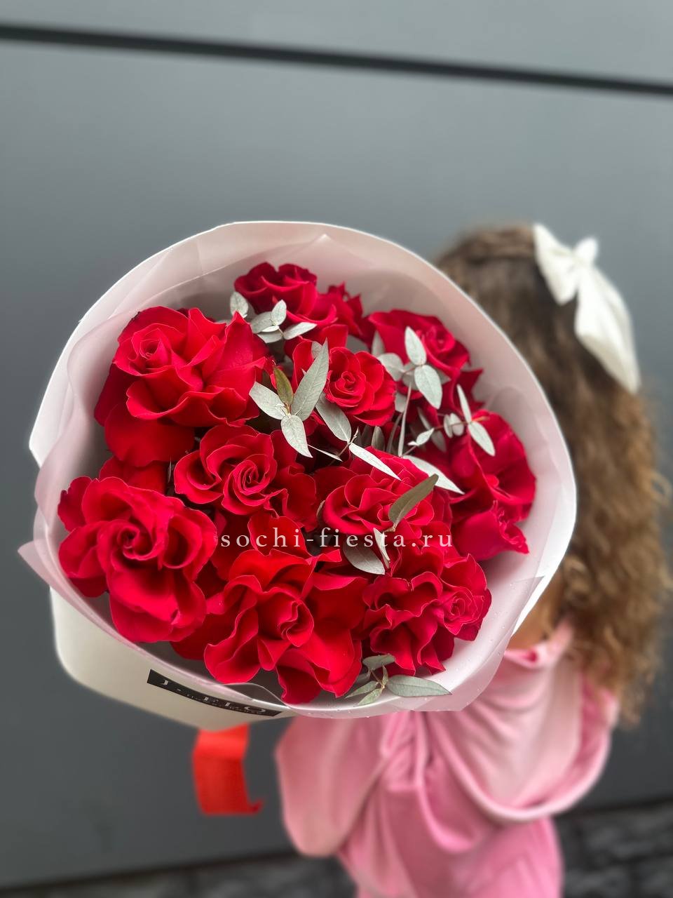 Одиннадцать французских роз с вывернутыми лепестками раскрывают всю глубину бутона. Насыщенный красный цвет и графичная форма создают яркое присутствие.