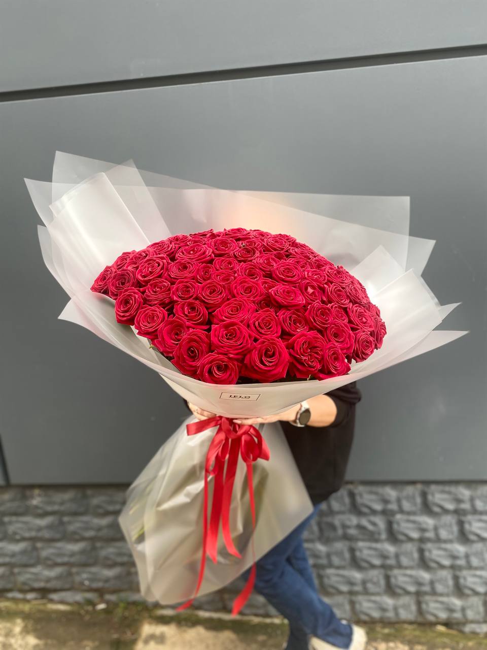 Compliment — это двадцать пять красных роз на длинных стеблях, собранных в классическую форму. Букет держит форму несколько дней и остаётся аккуратным даже в высокой вазе.