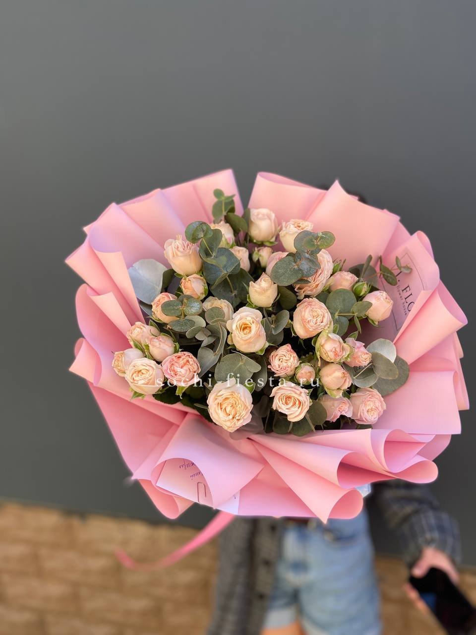 яркий букет из 11 пионовидных кустовых роз с эвкалиптом.