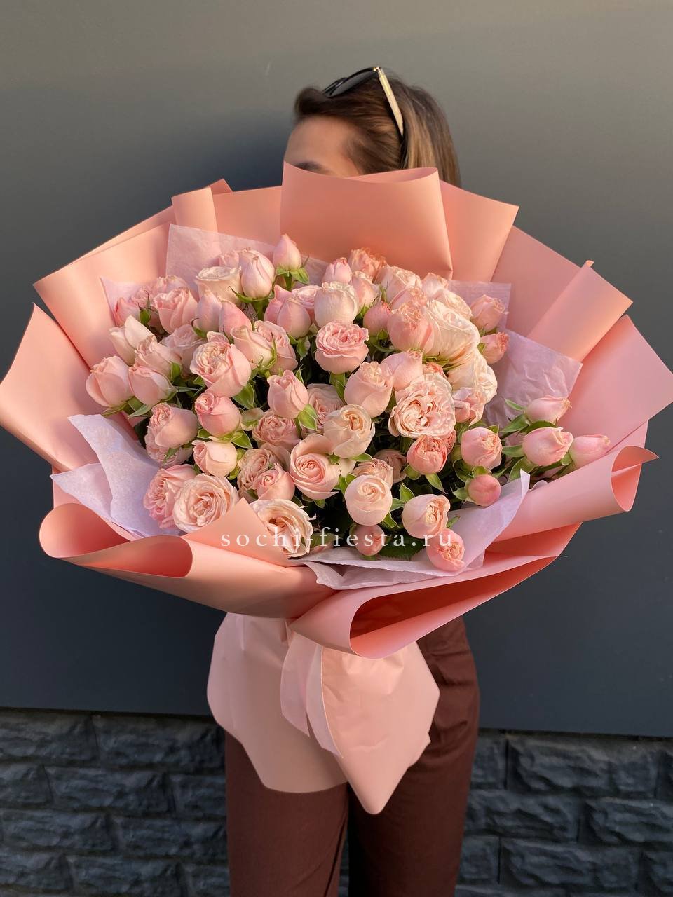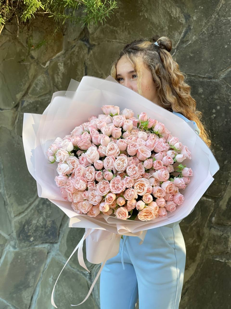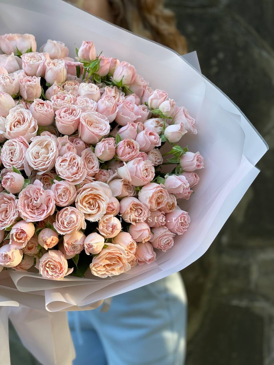 пионовидные розы Бомбастик нежных оттенков, лента, упаковка.