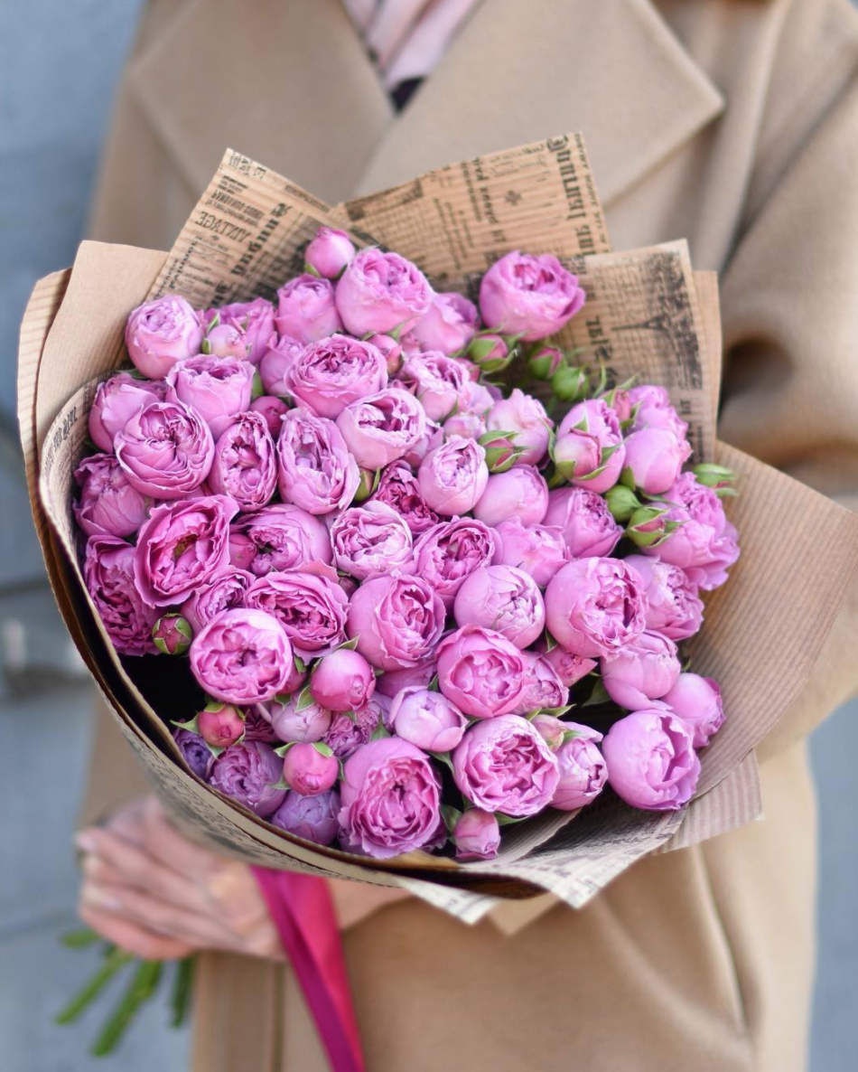 Пятьдесят одна ветка пионовидных кустовых роз Мисти Баблс дополнена эвкалиптом и хаммелациумом. Многослойные бутоны раскрываются пышными шапками в лавандово-розовой гамме. Воздушная зелень добавляет движение и свежесть всей композиции.