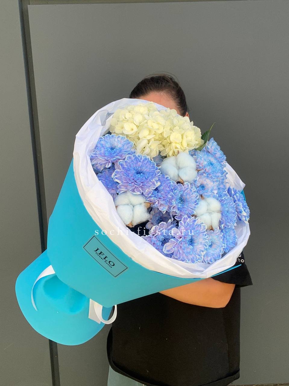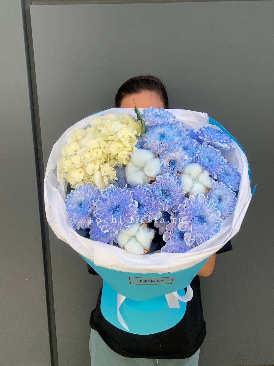 гортензия, эустома, кустовая роза, диантус, лента, упаковка Состав букета в несозон может нести незначительные изменения.