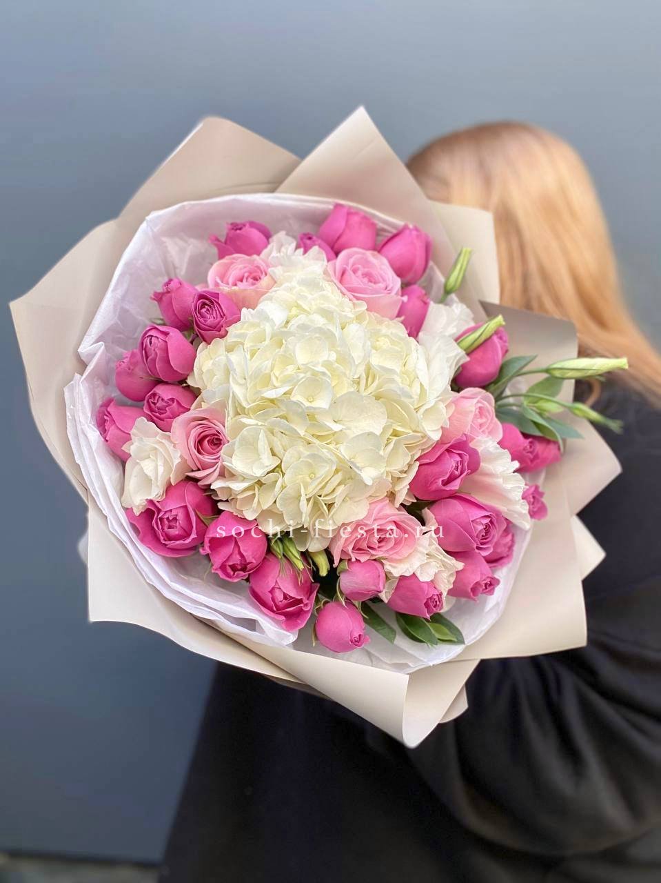 Белые розы и шары гортензии заполняют пространство плотно, но без тяжести. Озатамус вносит лёгкую текстуру, а эвкалипт завершает силуэт спокойной зеленью.