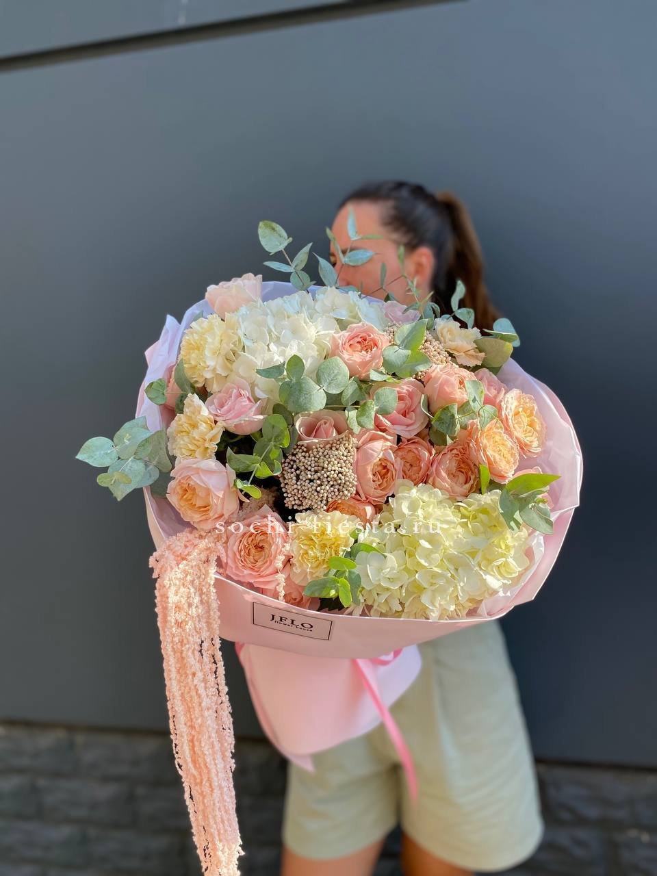 Пышная композиция с розами Джульетта раскрывается крупными бутонами и многослойной фактурой. Амарант и озатамус создают глубину, а гортензия завершает форму мягкими соцветиями.