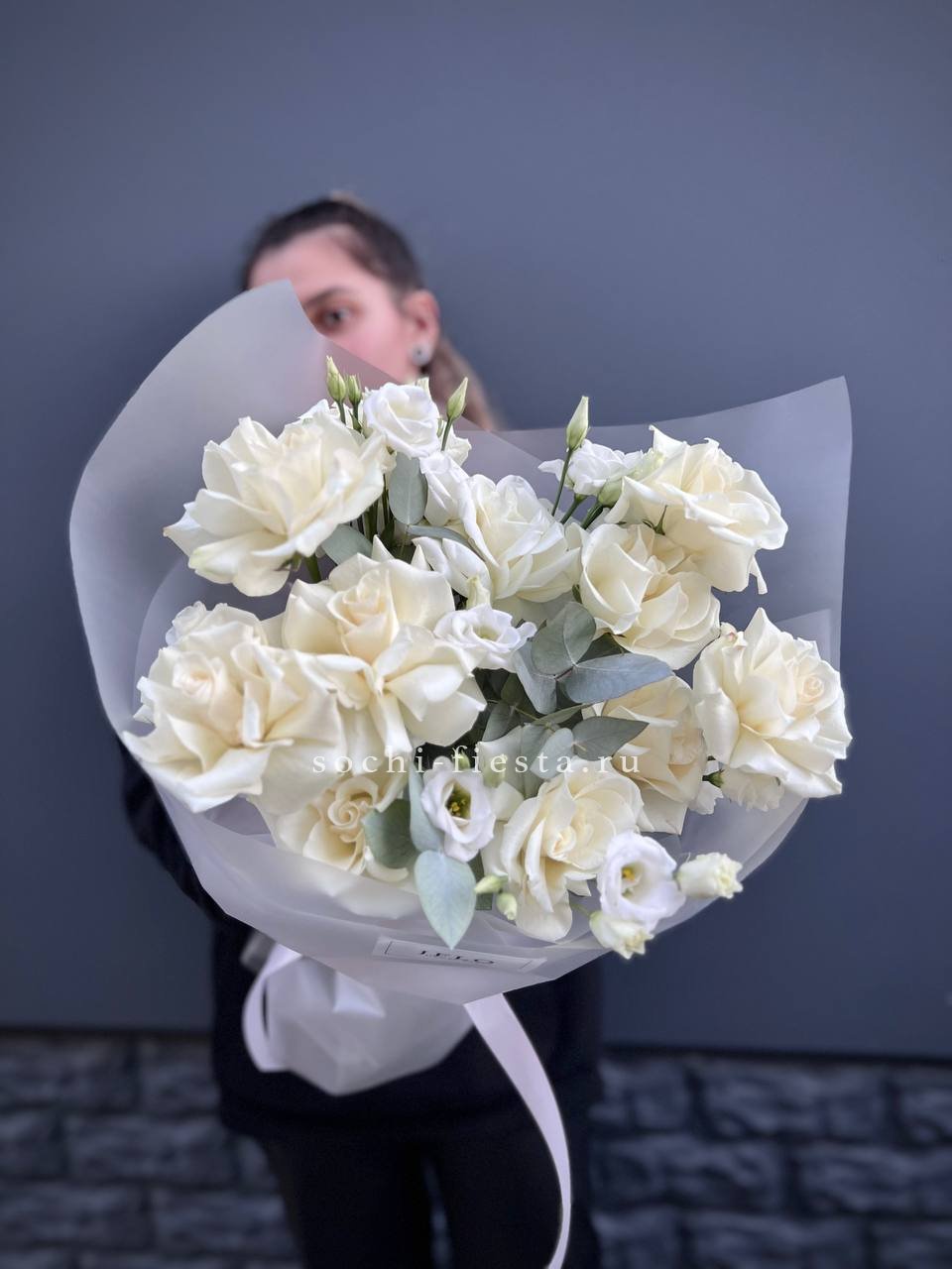 Вывернутые лепестки роз открывают объёмную сердцевину, эустома добавляет воздушности. Букет выглядит свежо и современно, эвкалипт завершает композицию матовой зеленью.