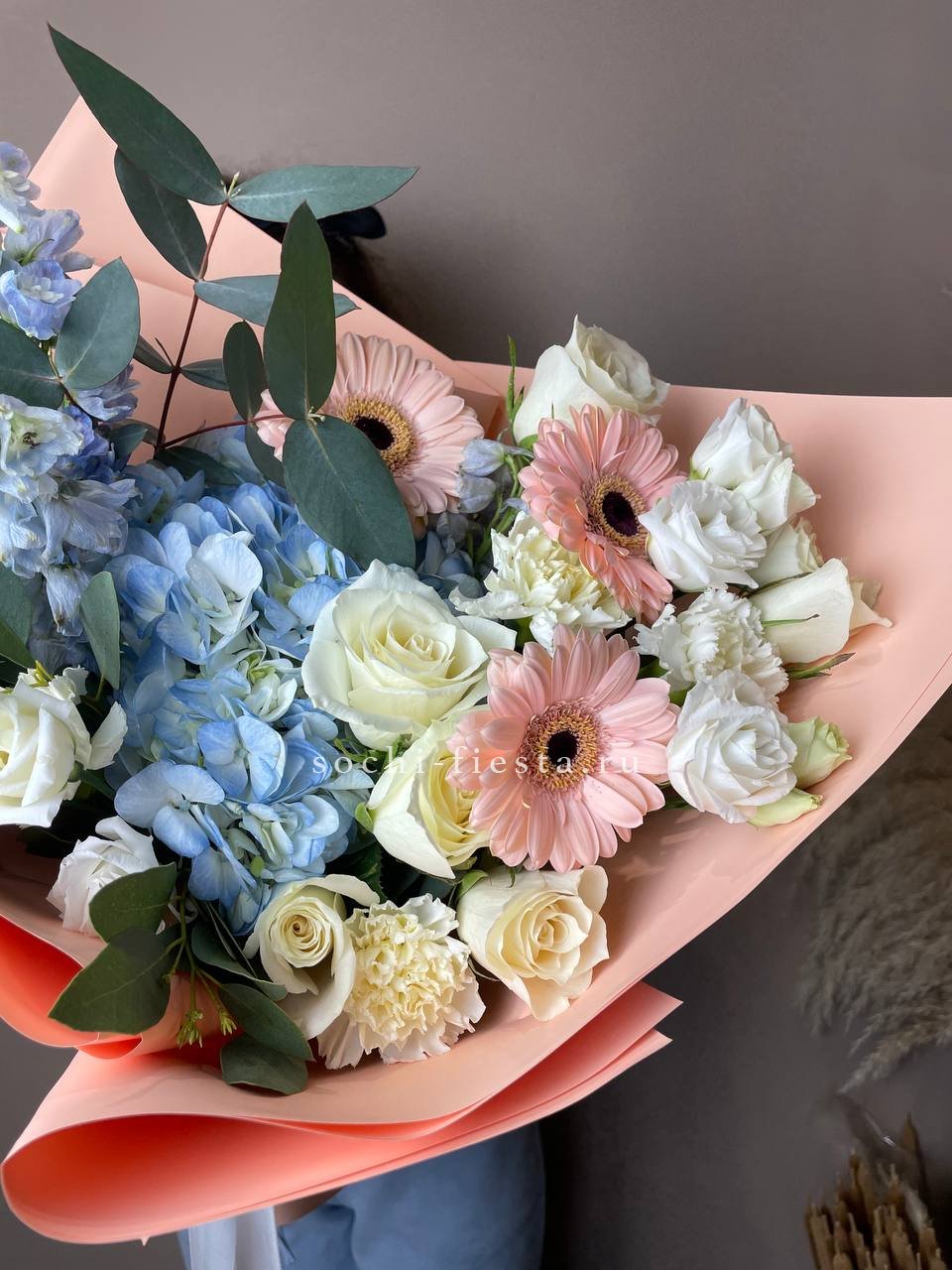 гортензия, роза, гербера, эустома, диантус, дельфиниум, эвкалипт, лента, дизайнерская пленка.