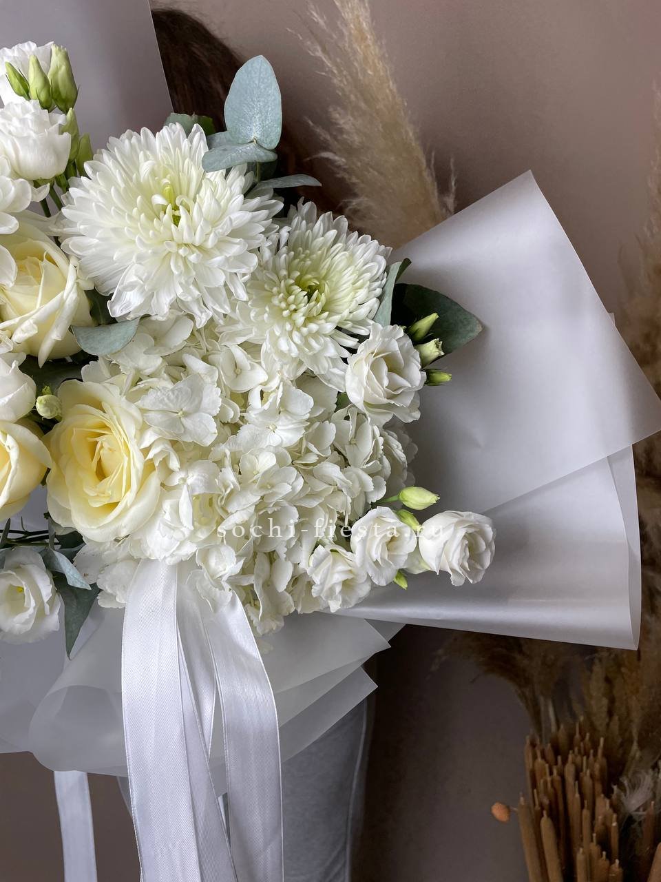 гортензия, хризантема, роза, эустома, упаковка, лента.