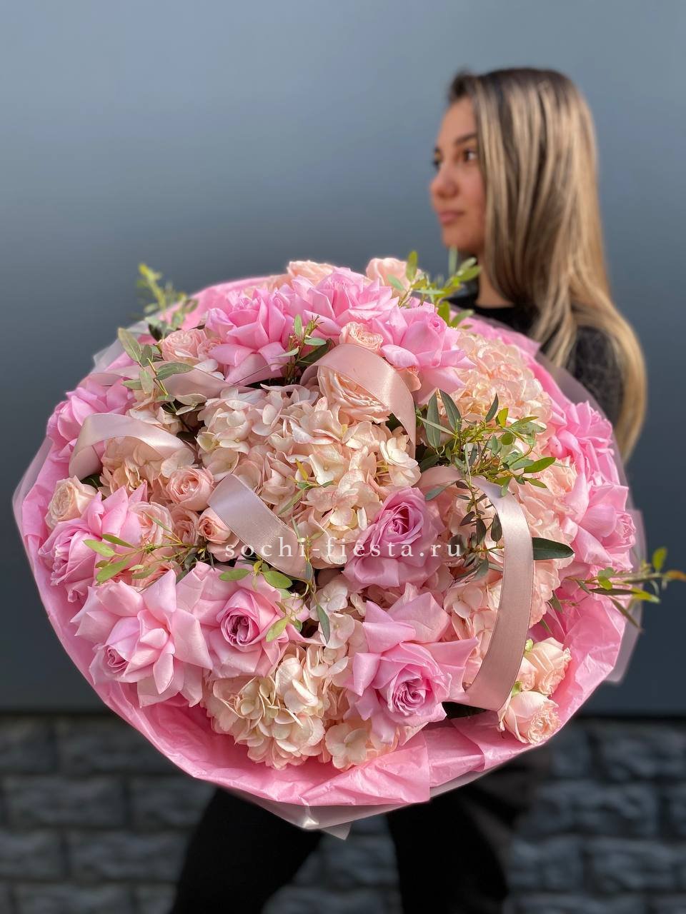 Белые розы и эустома образуют светлую основу, которую дополняют пионы и гортензия. Крафтовая упаковка удерживает форму, позволяя цветам раскрыться естественно и свободно.