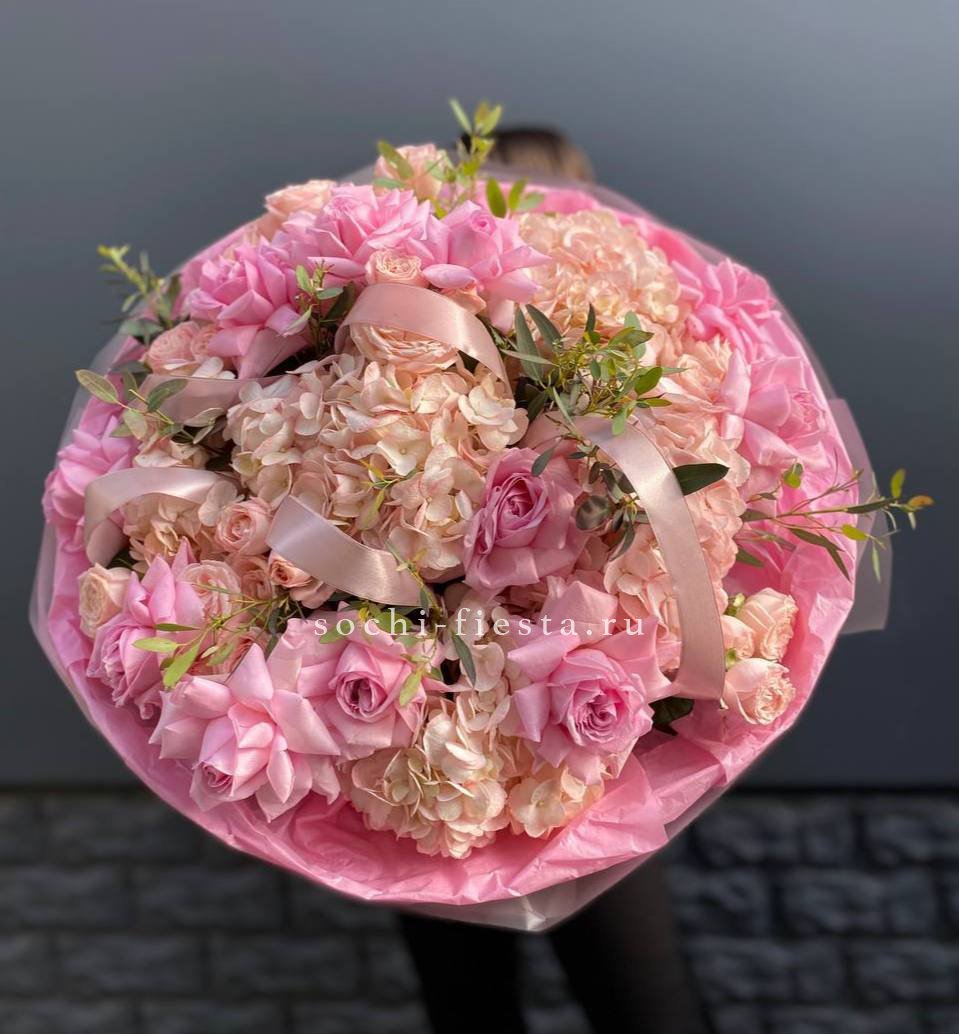 эустома, кустовые розы, белые  розы, гортензия, пионы (замена в зависимости от сезона) лента, крафт.