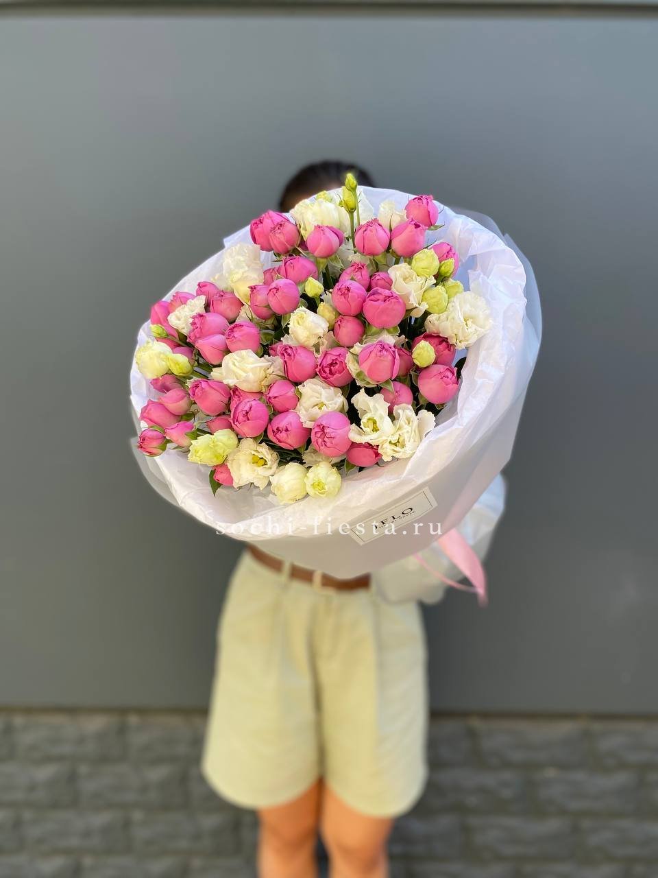 Кустовые розы и эустомы собраны в компактную форму с мягкими линиями. Сочетание нескольких оттенков создаёт живописный эффект без лишней пышности.