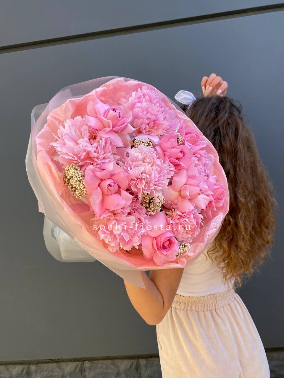 Плотные бутоны пионов собраны с розами в объёмную форму с мягким силуэтом. Озотамус добавляет воздушную текстуру по краям. Композиция в розовой гамме держит форму и выглядит цельно.