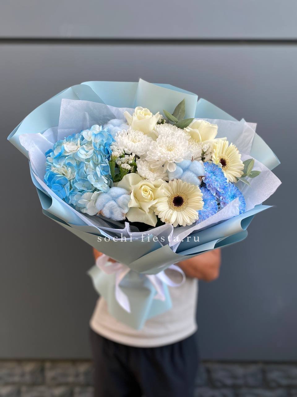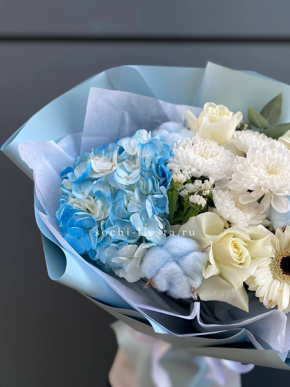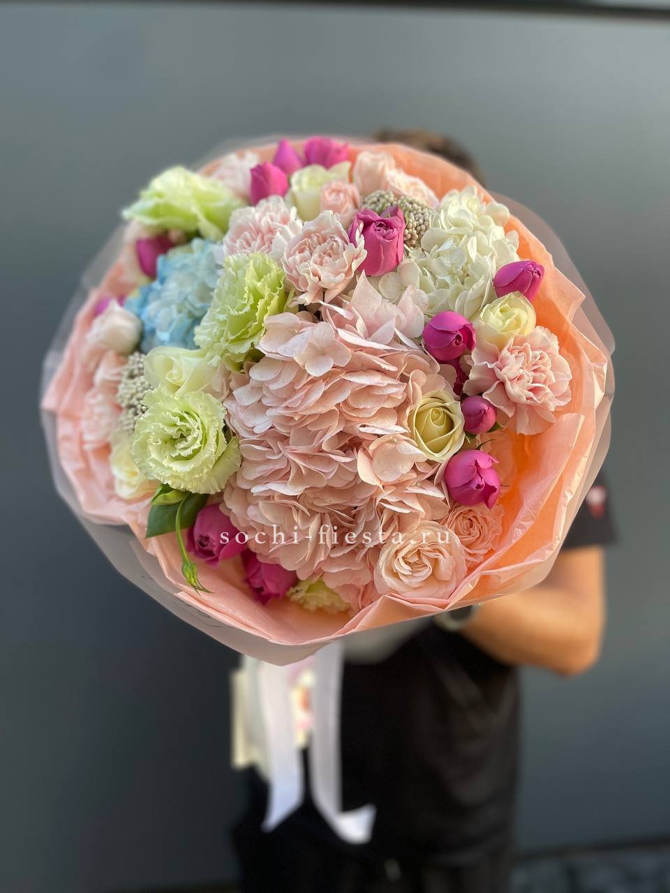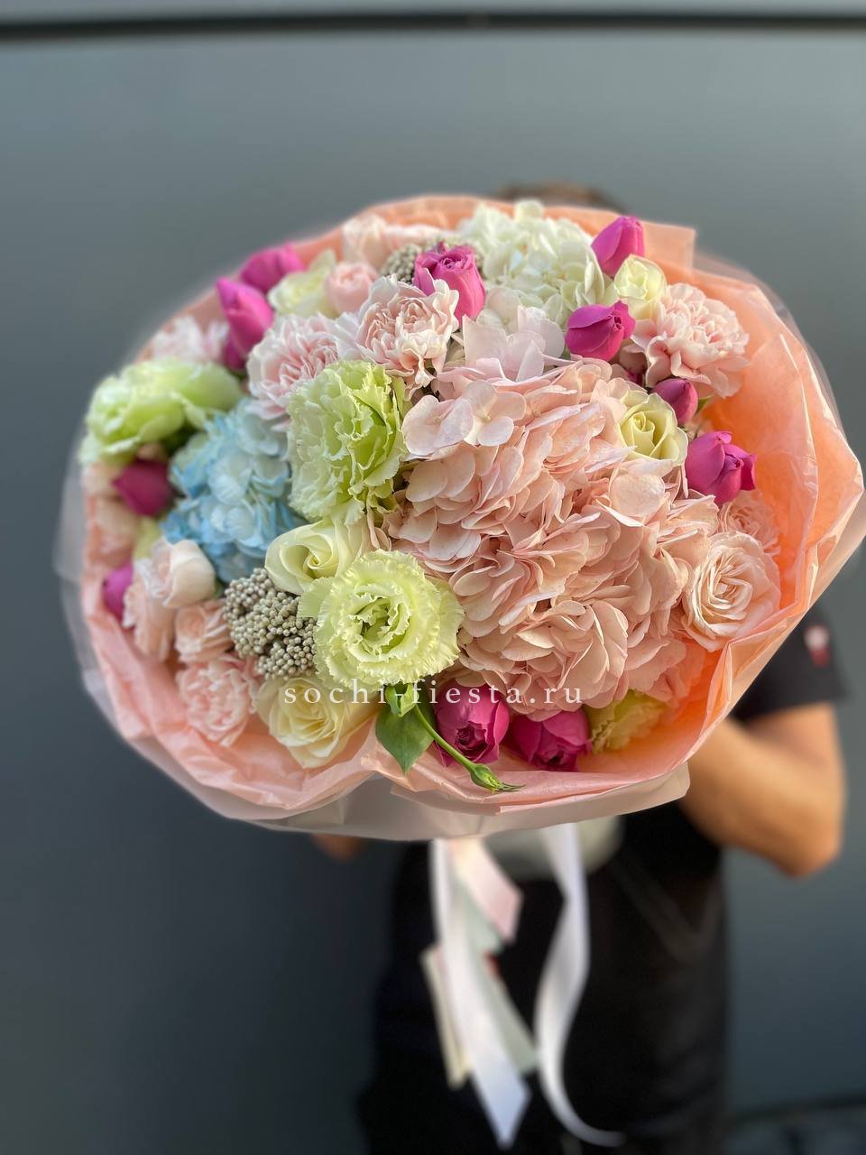 гортензия, диантус, кустовая пионовидная роза, эустома, вспомогательные цветы, эвкалипт, лента, дизайнерская упаковка.