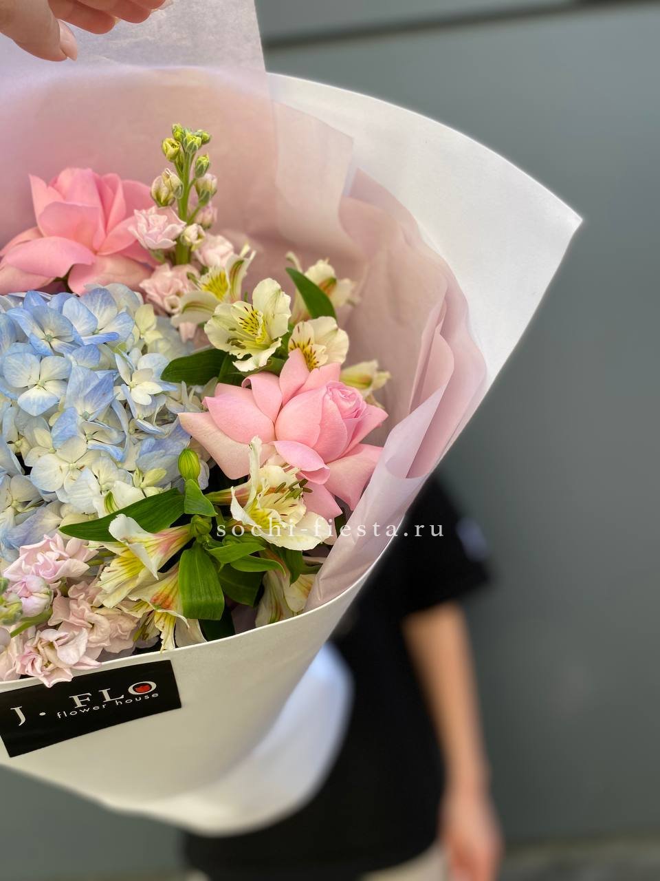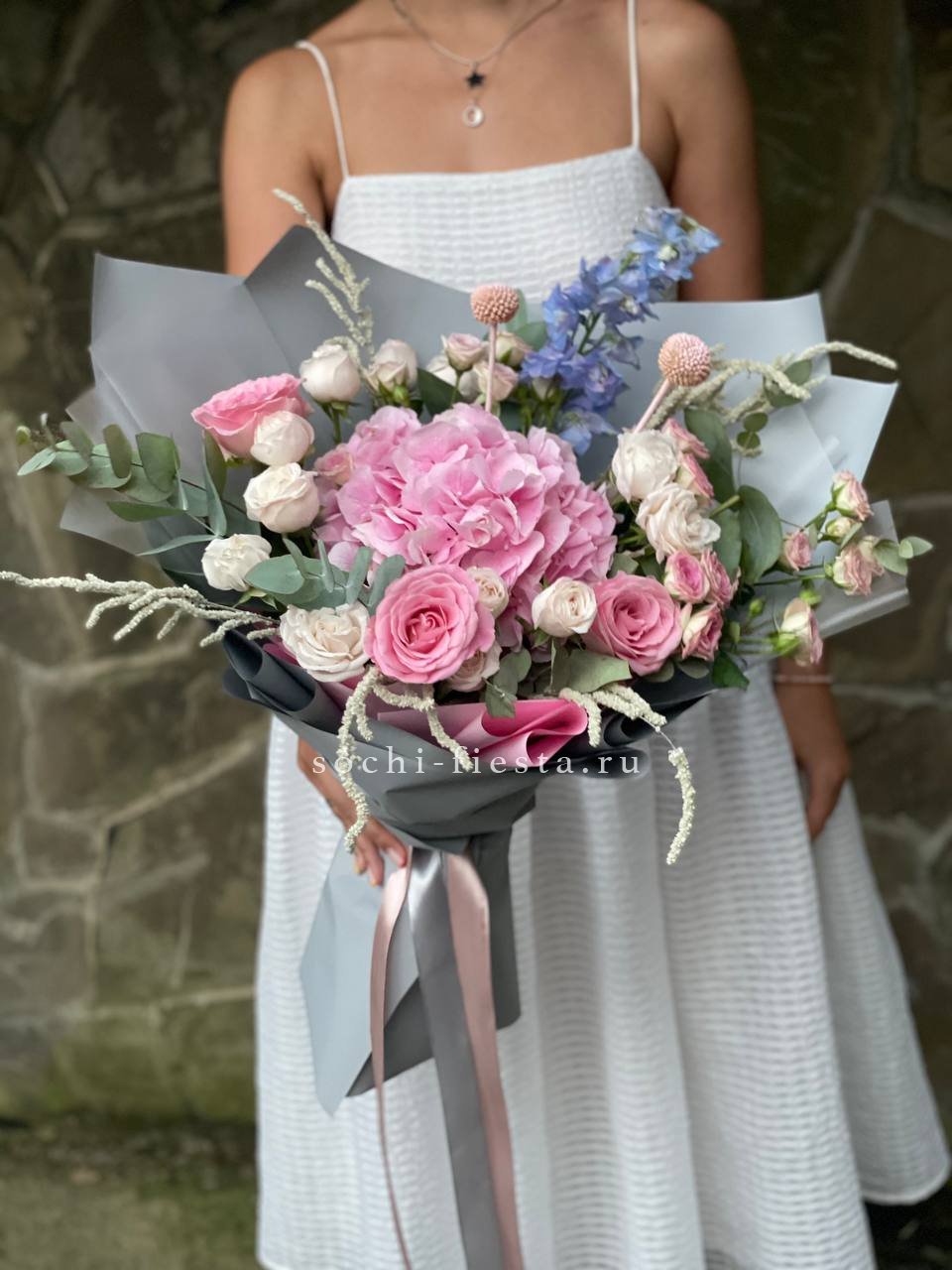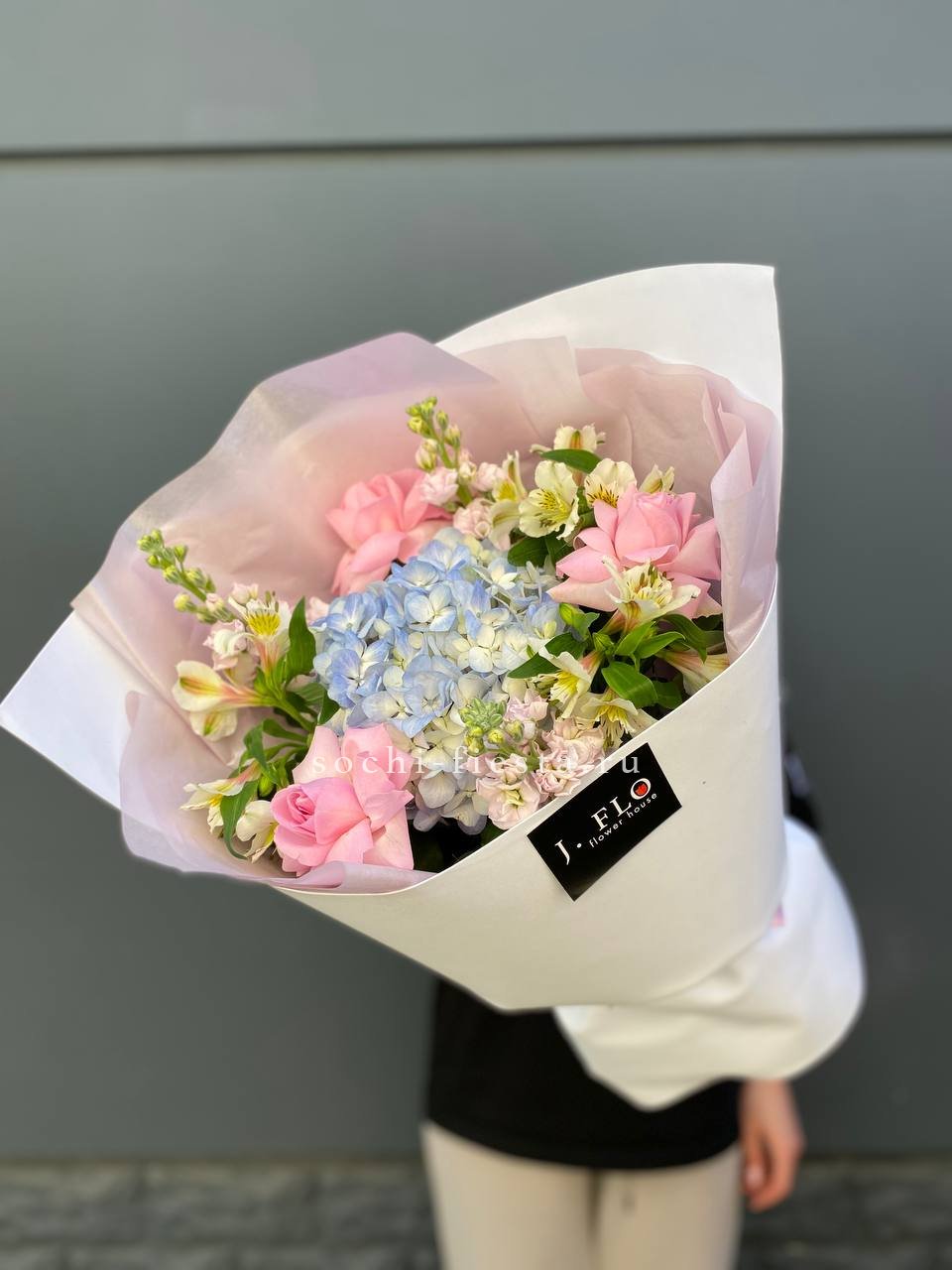 Этот пышный авторский букет напоминает нежное зефирное облако, в котором гармонично сочетаются объемные формы и изысканные оттенки. Композиция представляет собой микс из крупных соцветий гортензии и кустовых роз в пастельной гамме.