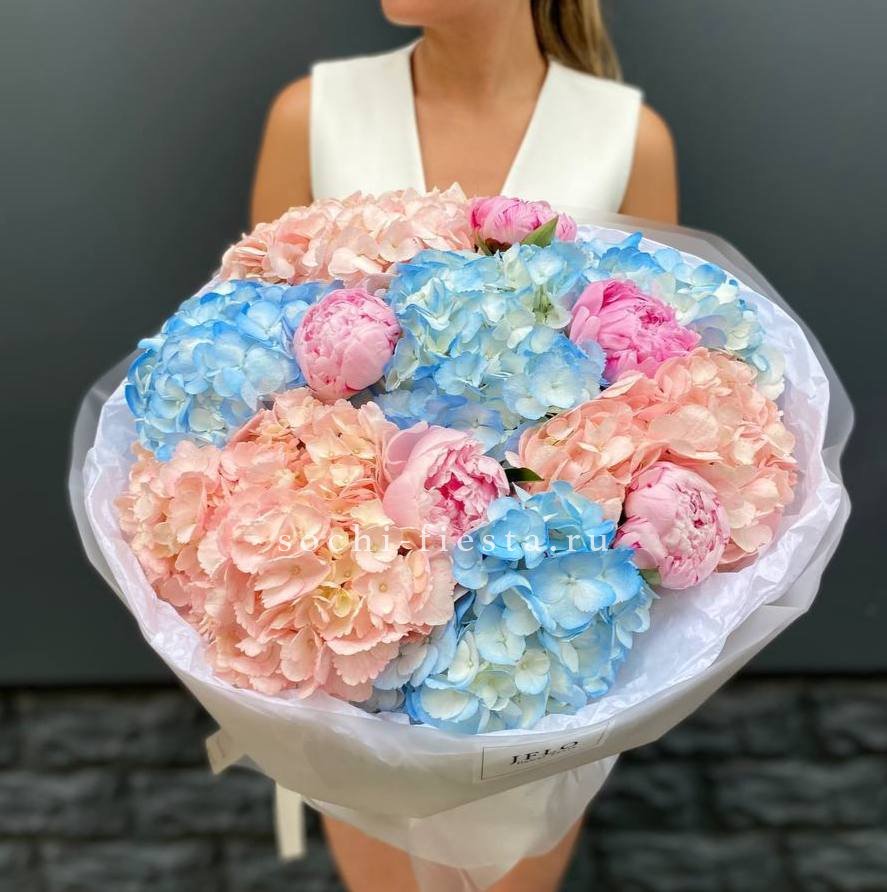 Два отдельных букета в одной композиции: пышные головки гортензий и густомахровые пионы. Каждая часть завернута в тишью и пленку, сохраняя свою форму и свежесть.