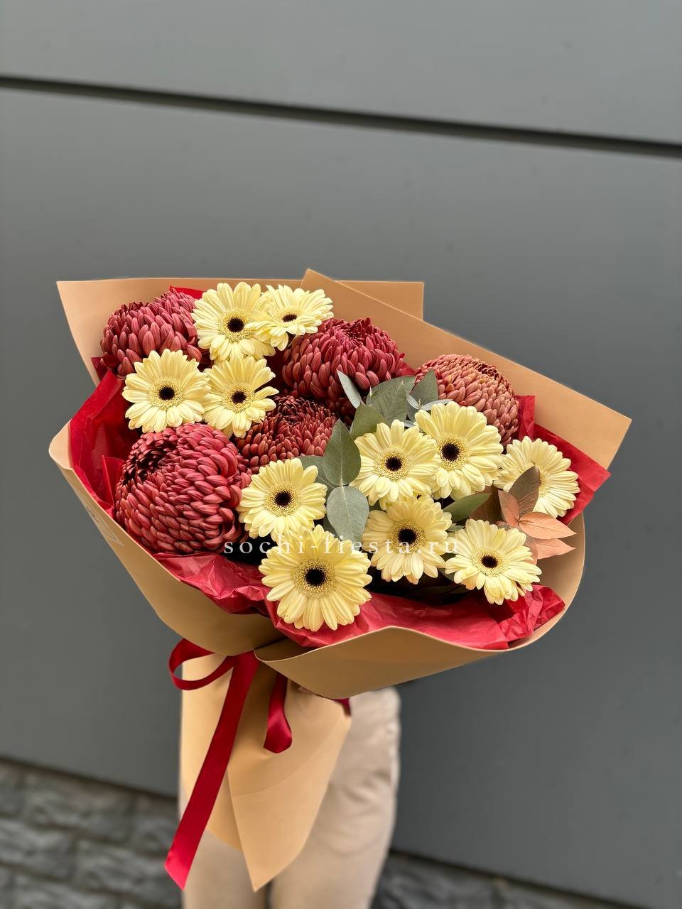 хризантемы Бигуди, герберы, эвкалипт, оформление.
