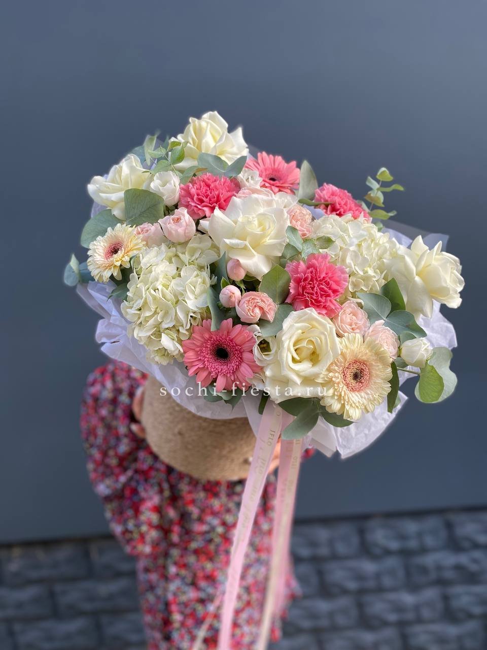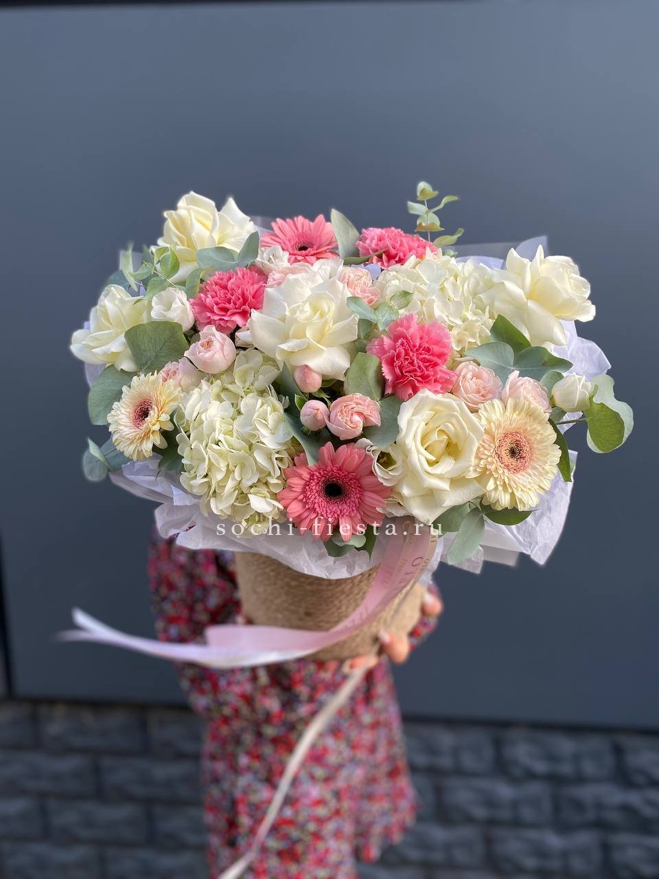 Летняя композиция объединяет диантусы, розы и гортензию в свободной форме. Эустома добавляет воздушности, а эвкалипт создает мягкий фон. Букет с характером теплого сезона и яркими акцентами.