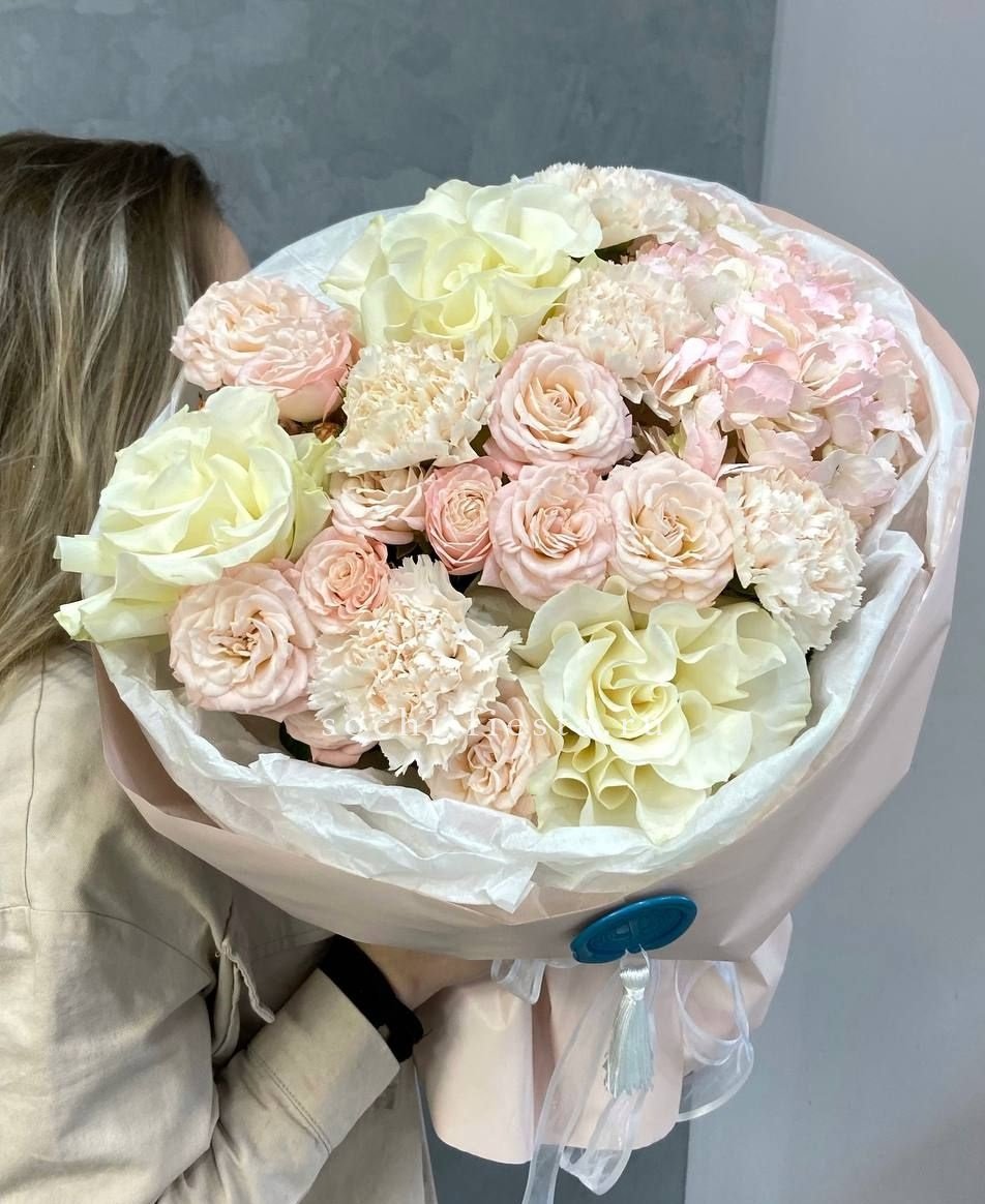 диантусы, розы, эустома, гортензия, эвкалипт, вспомогательные цветы, лента, корейская пленка.