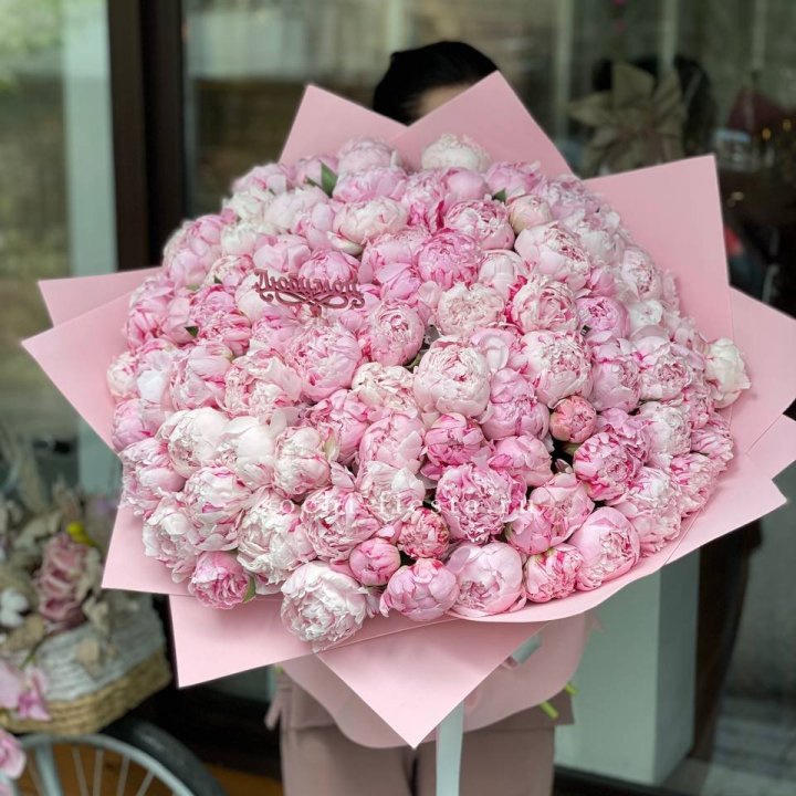 Пионы в сезон (май-июнь) — второй по популярности формат. Sarah Bernhardt, Coral Charm, Bowl of Cream. Моно-букет из 25 пионов или смешанная композиция. В Иркутске пионы часто заказывают заранее, запас срезки ограничен местной логистикой.