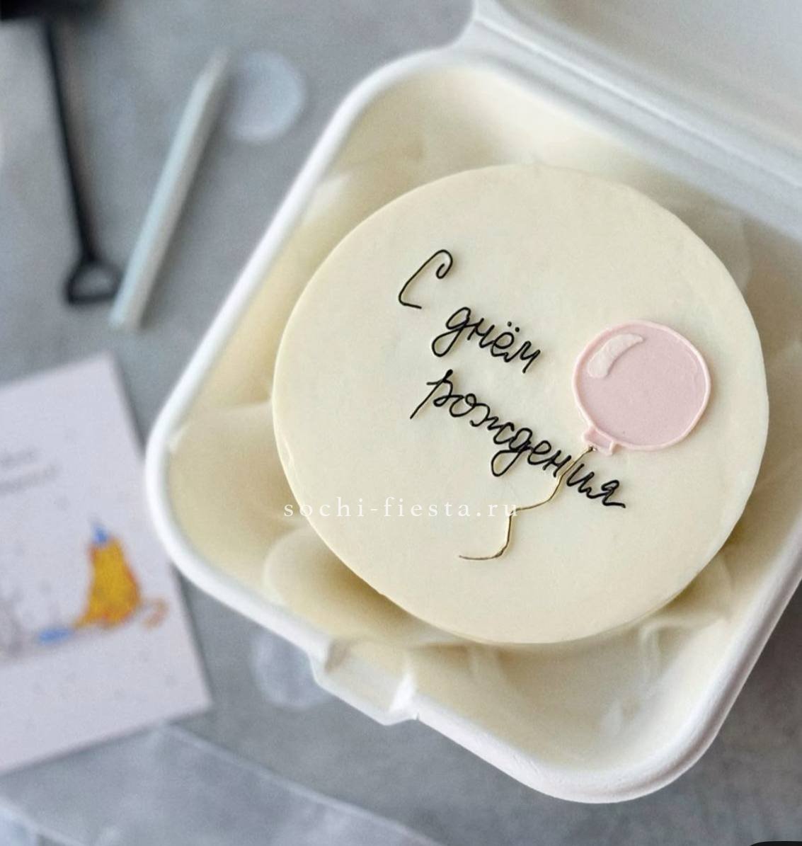 Миниатюрный торт с яркой надписью и домашним теплом в каждом слое. Крем держит форму, а бисквит остается влажным благодаря небольшому объему и свежести выпечки.