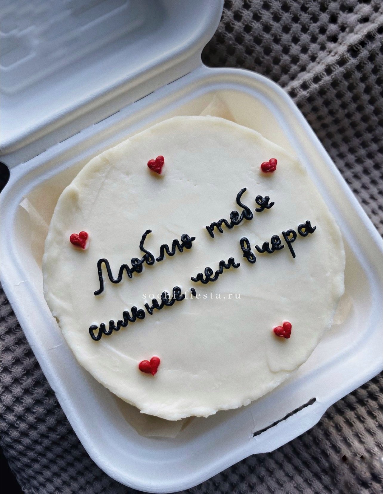 Дизайнерский бенто-торт с романтичной надписью и воздушным кремом. Компактная форма позволяет разместить его даже на небольшом столике. На выбор клубничный пломбир или шоколадный трюфель.