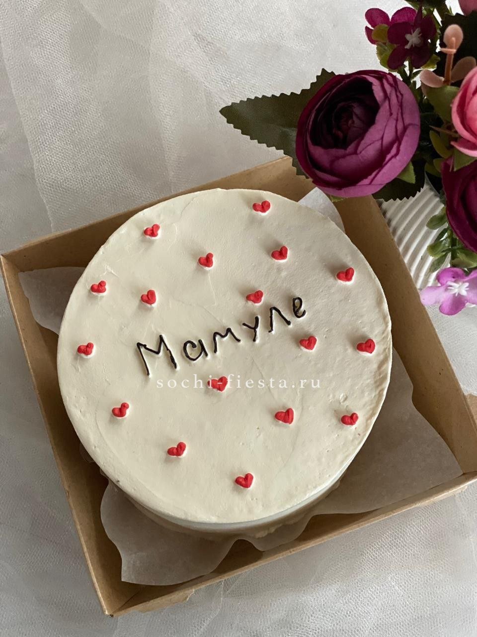 Весенний бенто-торт в бело-розовых тонах с акцентом на праздничную дату. Кремовая текстура создаёт лёгкий рельеф и цветочные мотивы. Два вкуса начинки на выбор.