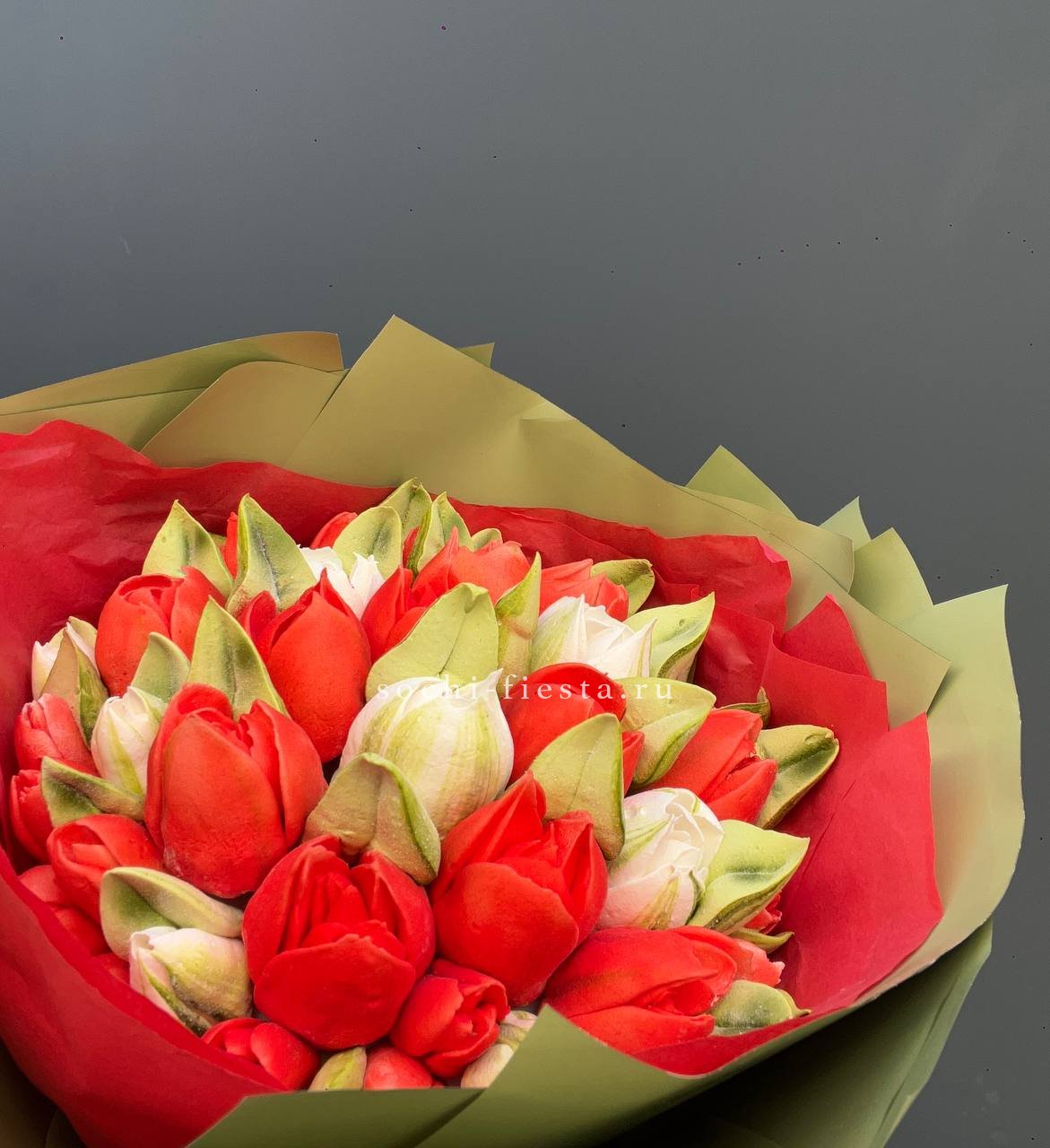 зефир в форме букета тюльпанов (каждый тюльпан выполнен отдельно и собран в букет). Состав: сахар, патока, пектин, агар, яблочное пюре, яичный белок, натуральный краситель, лимонная кислота. Цена за 1букет, размер SX.