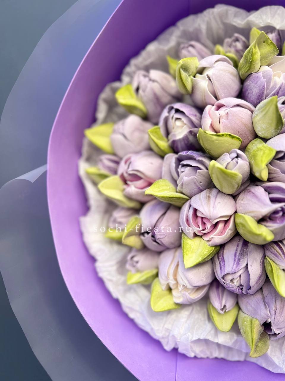 Фиолетовые тюльпаны из воздушного зефира собраны в объёмную композицию. Каждый бутон выполнен отдельно на яблочном пюре и пектине с натуральными красителями.